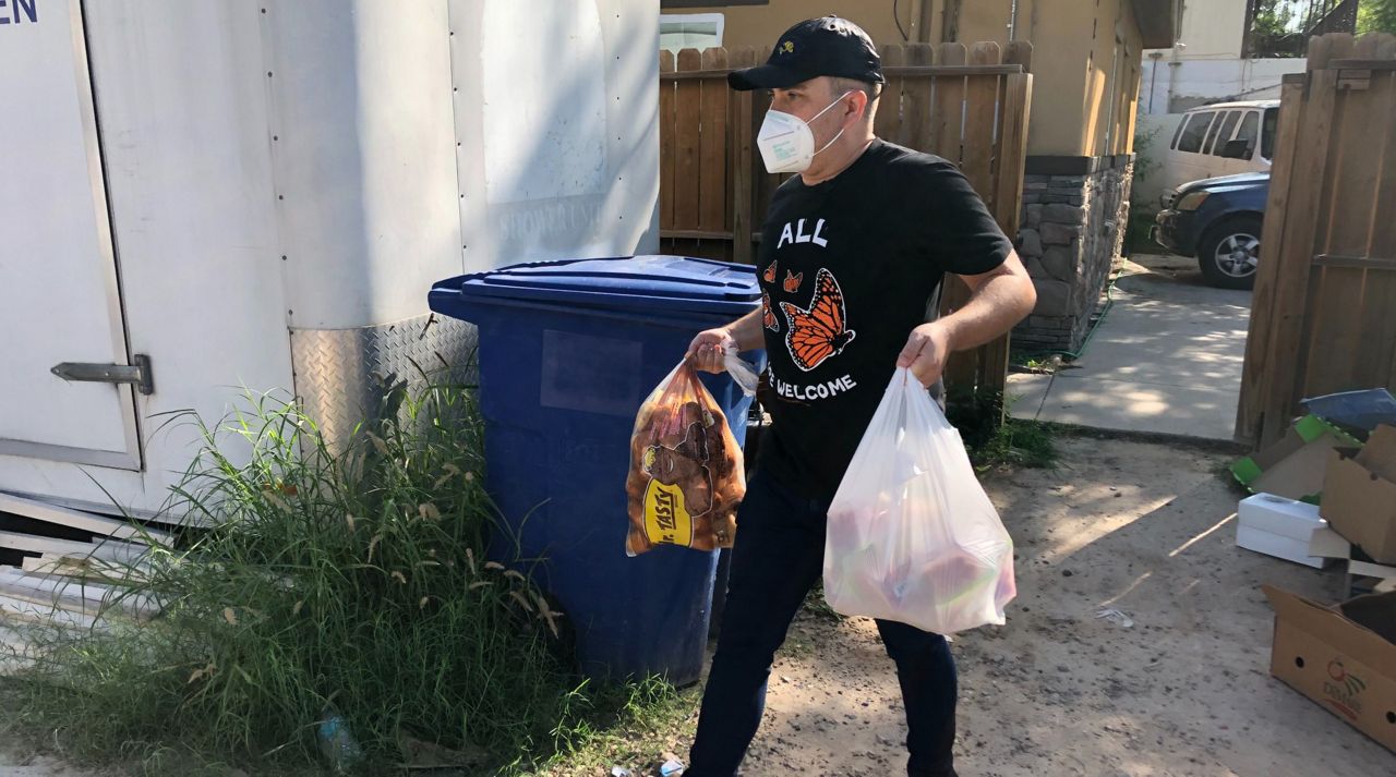The volunteer for Interfaith Welcome Coalition of San Antonio takes inventory of the goods he considers humanitarian essentials.